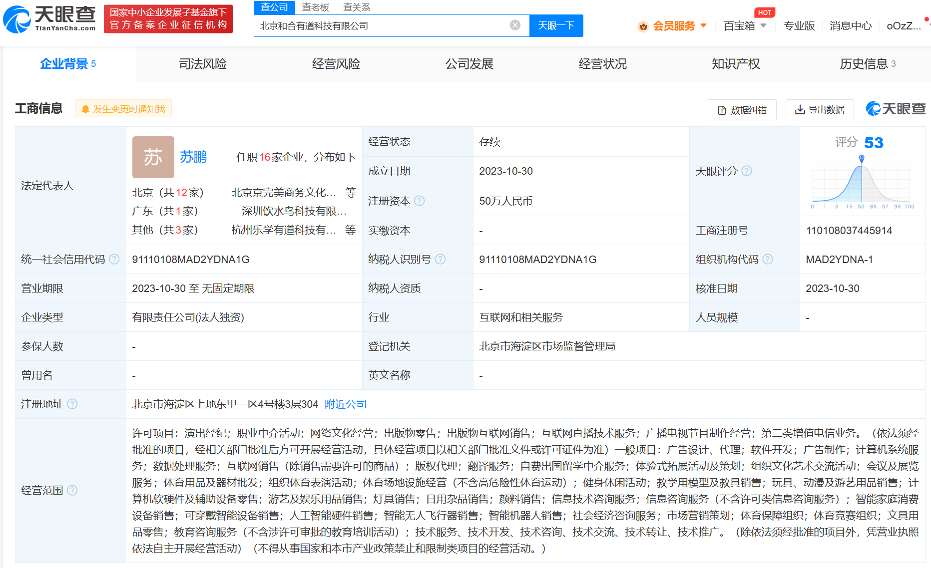 南方财经11月1日电,天眼查App显示,近日,北京和合有道科技有限公司成立,法定代表人为苏鹏,注册资本50万人民币,经营范围含演出经纪、互联网直播技术服务、人工智能硬件销售、智能无人飞行器销售、智能机器人销售、体育竞赛组织等。股权全景穿透图显示,该公司由有道(广州)计算机系统有限公司全资持股,后者由网易有道CEO周枫与高级副总裁吴迎晖共同持股。