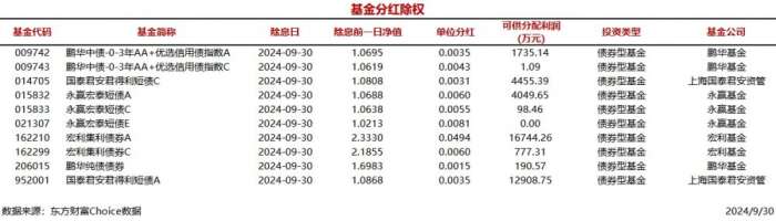 南方财经9月30日电,据东方财富Choice数据统计,今日共有10只基金分红除权(A/C类分开计算),均为债券型基金,累计可供分配利润4.1亿元。