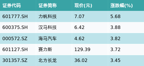 截至收盘,汽车整车主题涨跌幅最高的五只股票为:力帆科技(601777.SH)、汉马科技(600375.SH)、海马汽车(000572.SZ)、赛力斯(601127.SH)与北方长龙(301357.SZ)。详情见下表: