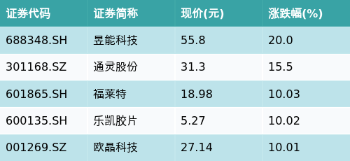 截至午间收盘,太阳能主题涨跌幅最高的五只股票为:昱能科技(688348.SH)、通灵股份(301168.SZ)、福莱特(601865.SH)、乐凯胶片(600135.SH)与欧晶科技(001269.SZ)。详情见下表: