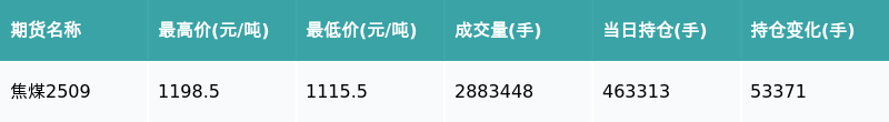 南财智讯7月24日电,南财金融终端盘后期货数据显示,大连商品交易所的焦煤主力合约收涨7.97%,收盘报1198.5元/吨,日内资金流入7.34亿元。其他相关指标见下表: