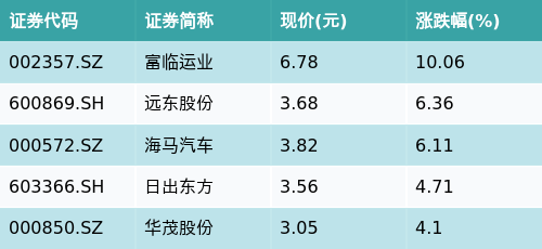截至收盘,参股银行主题涨跌幅最高的五只股票为:富临运业(002357.SZ)、远东股份(600869.SH)、海马汽车(000572.SZ)、日出东方(603366.SH)与华茂股份(000850.SZ)。详情见下表: