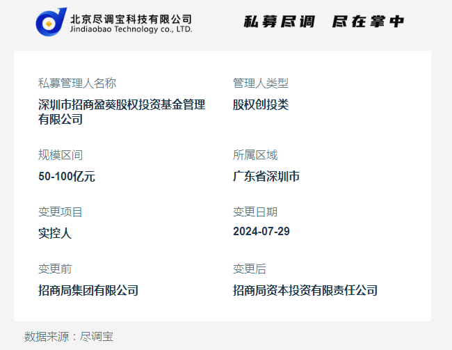 南方财经7月30日电,据尽调宝数据显示,7月29日深圳市招商盈葵股权投资基金管理有限公司发生实控人变更,由之前的招商局集团有限公司变更为招商局资本投资有限责任公司。中基协登记信息显示,深圳市招商盈葵股权投资基金管理有限公司是一家私募股权、创业投资基金管理人,成立于2016年10月27日,注册资本1000.00万元,其中实缴资本1000.00万元,管理规模产品区间为50-100亿元,实际控制人为招商局资本投资有限责任公司。