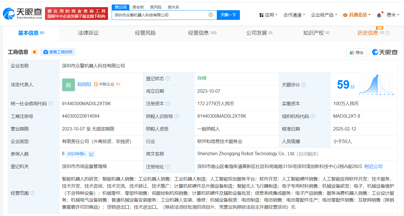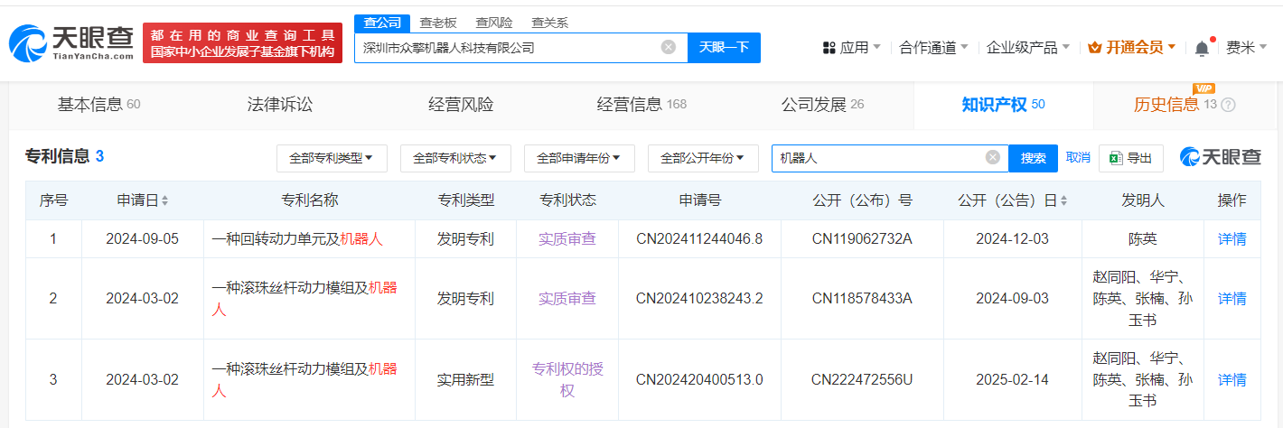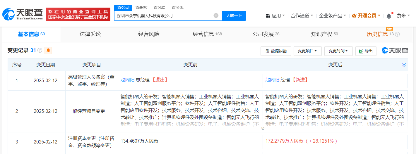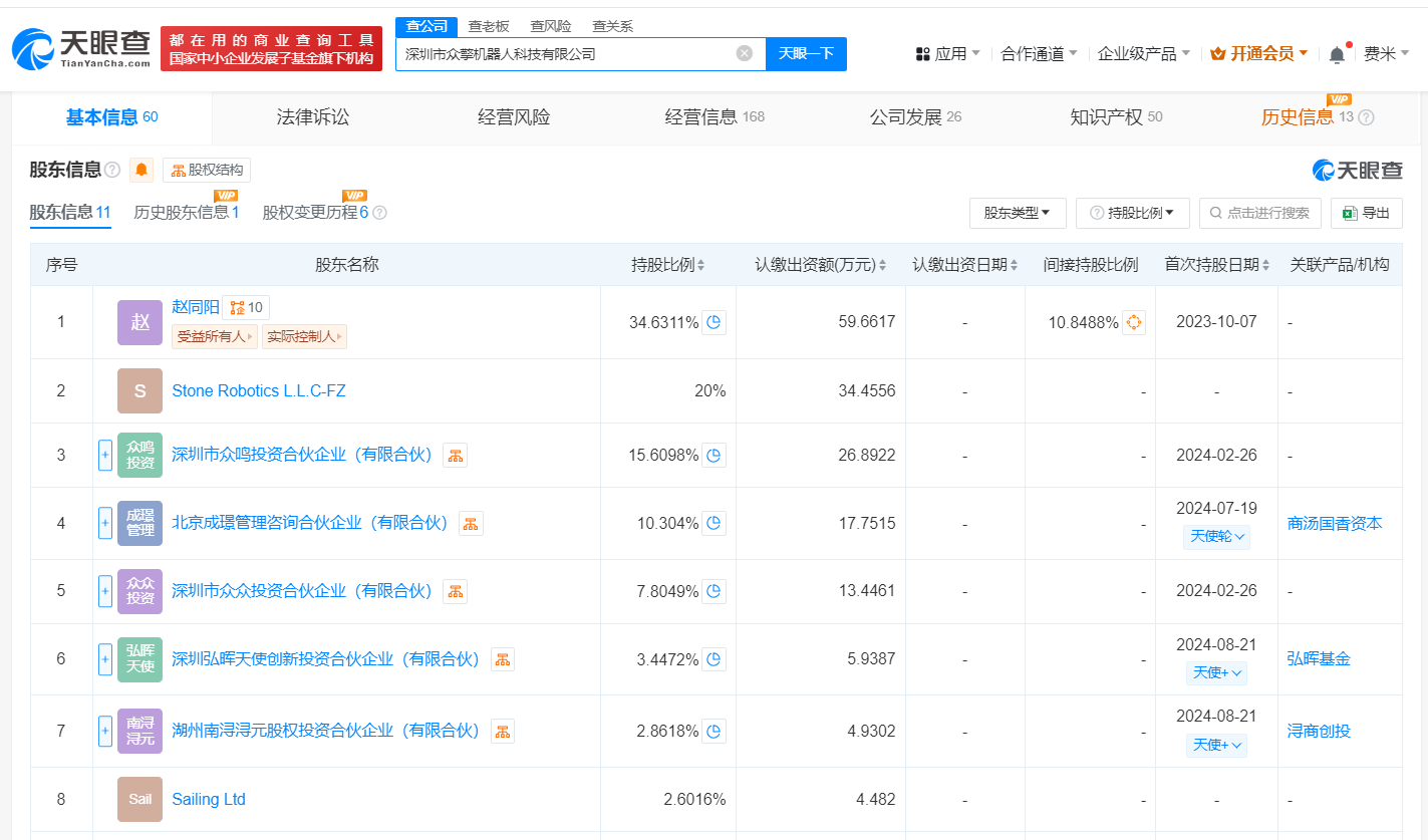 南方财经2月24日电,据媒体报道,近日,深圳众擎科技完成全球首例人形机器人前空翻特技,展示了众擎机器人不仅行走优雅稳定,还具有高速动态的实力。天眼查App显示,深圳市众擎机器人科技有限公司成立于2023年10月,法定代表人为赵同阳,经营范围含智能机器人的研发、智能机器人销售、工业机器人销售等,由赵同阳、深圳市众鸣投资合伙企业(有限合伙)、北京成璟管理咨询合伙企业(有限合伙)等共同持股。变更记录显示,近期,该公司新增Sailing Ltd、Stone Robotics L.L.C-FZ等为股东,注册资本由约134.5万人民币增至约172.3万人民币,增幅约28%。知识产权信息显示,该公司拥有“一种回转动力单元及机器人”、“一种滚珠丝杆动力模组及机器人”等多项机器人相关专利。此外,该公司还申请注册了“众擎”“ZENGINEAI”“engineAI”等商标,国际分类为机械设备、科学仪器、教育娱乐等,当前商标状态大多为等待实质审查。