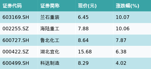 截至早盘收盘,煤化工主题涨跌幅最高的五只股票为:兰石重装(603169.SH)、海陆重工(002255.SZ)、鲁北化工(600727.SH)、湖北宜化(000422.SZ)与科达制造(600499.SH)。详情见下表: