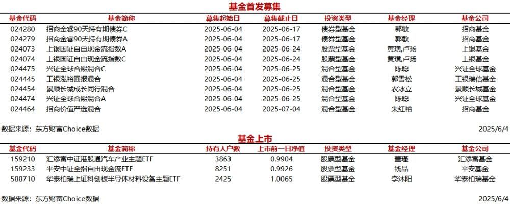 南方财经6月4日电,据东方财富Choice数据统计,今日共有9只基金首发募集(A/C类分开计算),包括5只混合型基金、2只股票型基金、2只债券型基金。另外,今日有3只基金上市。