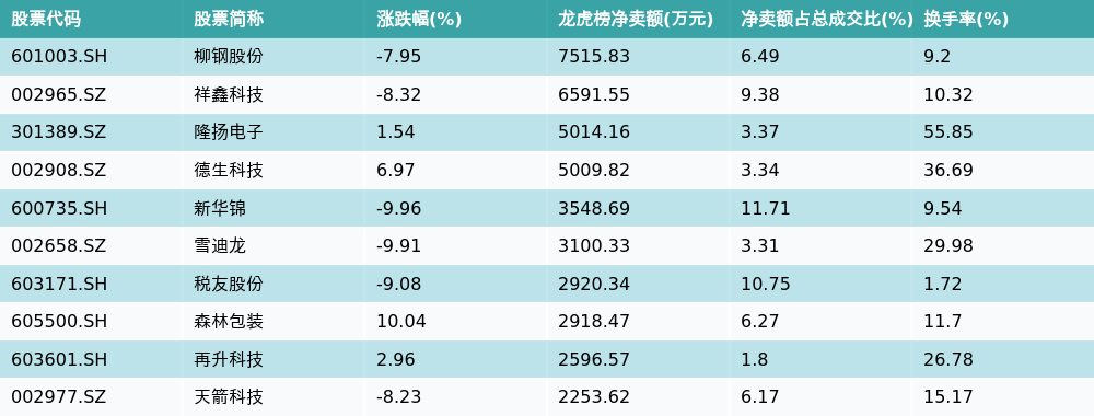 南财智讯7月7日电,南财金融终端数据显示,因当日异动登上龙虎榜的个股中,龙虎榜中资金净流出最多的前三位分别是柳钢股份(601003.SH)、祥鑫科技(002965.SZ)与隆扬电子(301389.SZ)。其中排名第一的柳钢股份被净卖出0.75亿元,占总成交金额的6.49%。柳钢股份收盘下跌7.95%,换手率为9.2%。净卖出额前10个股详情见下图: