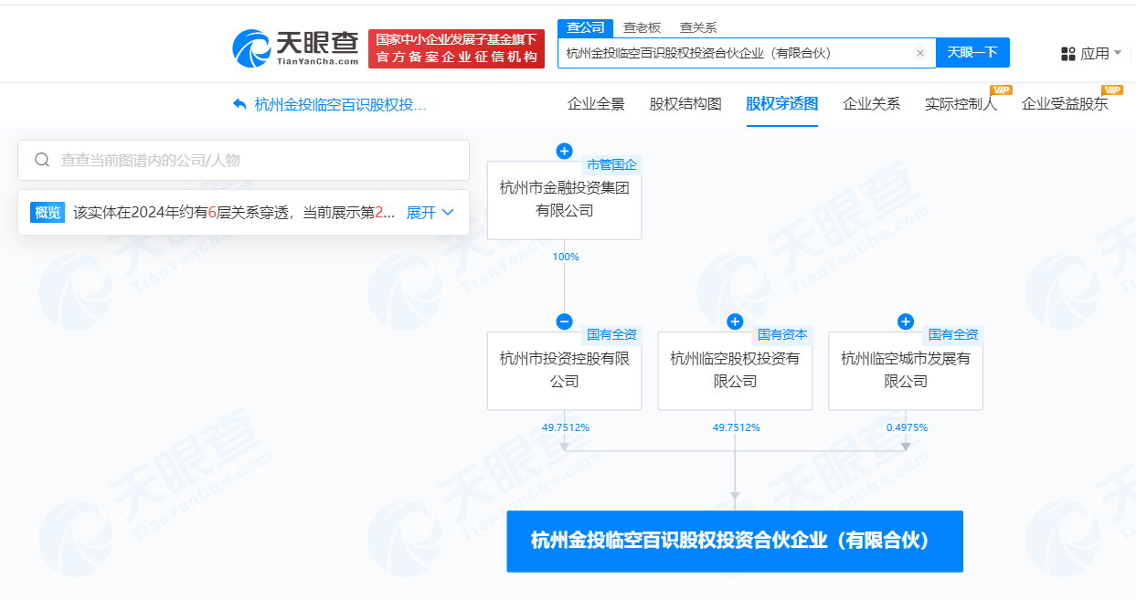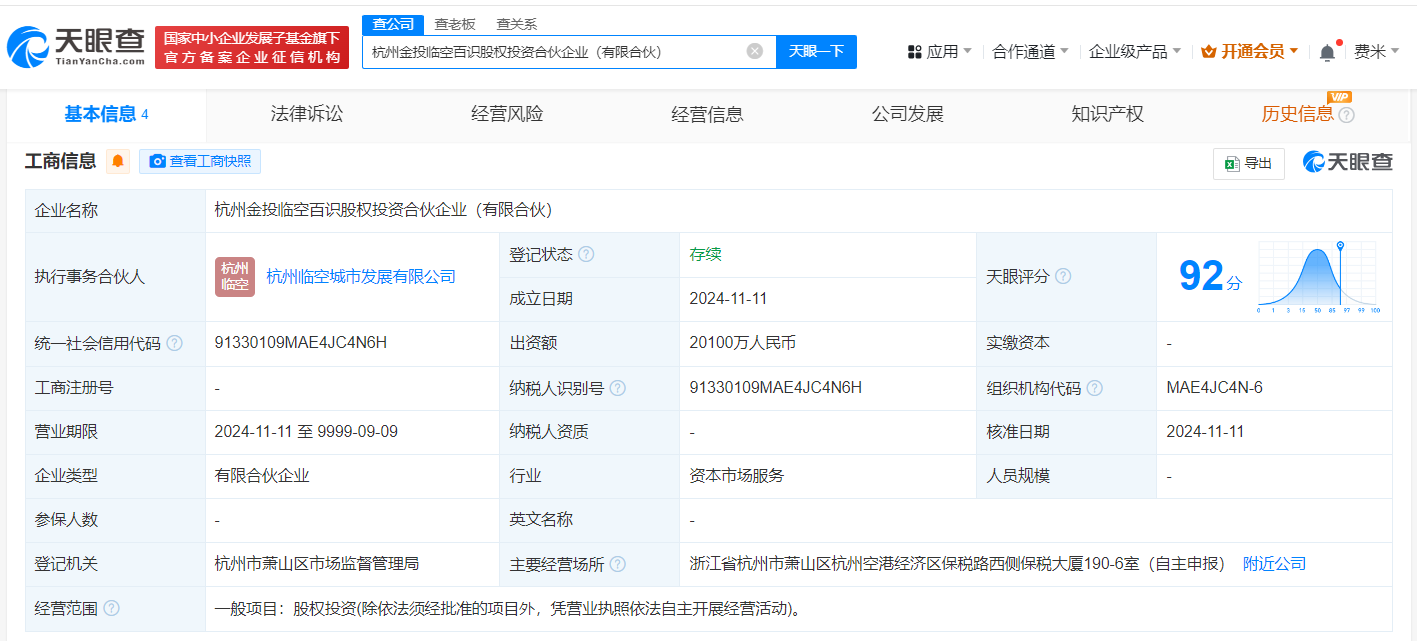 杭州金投等成立临空百识股权投资合伙企业 出资额2亿元