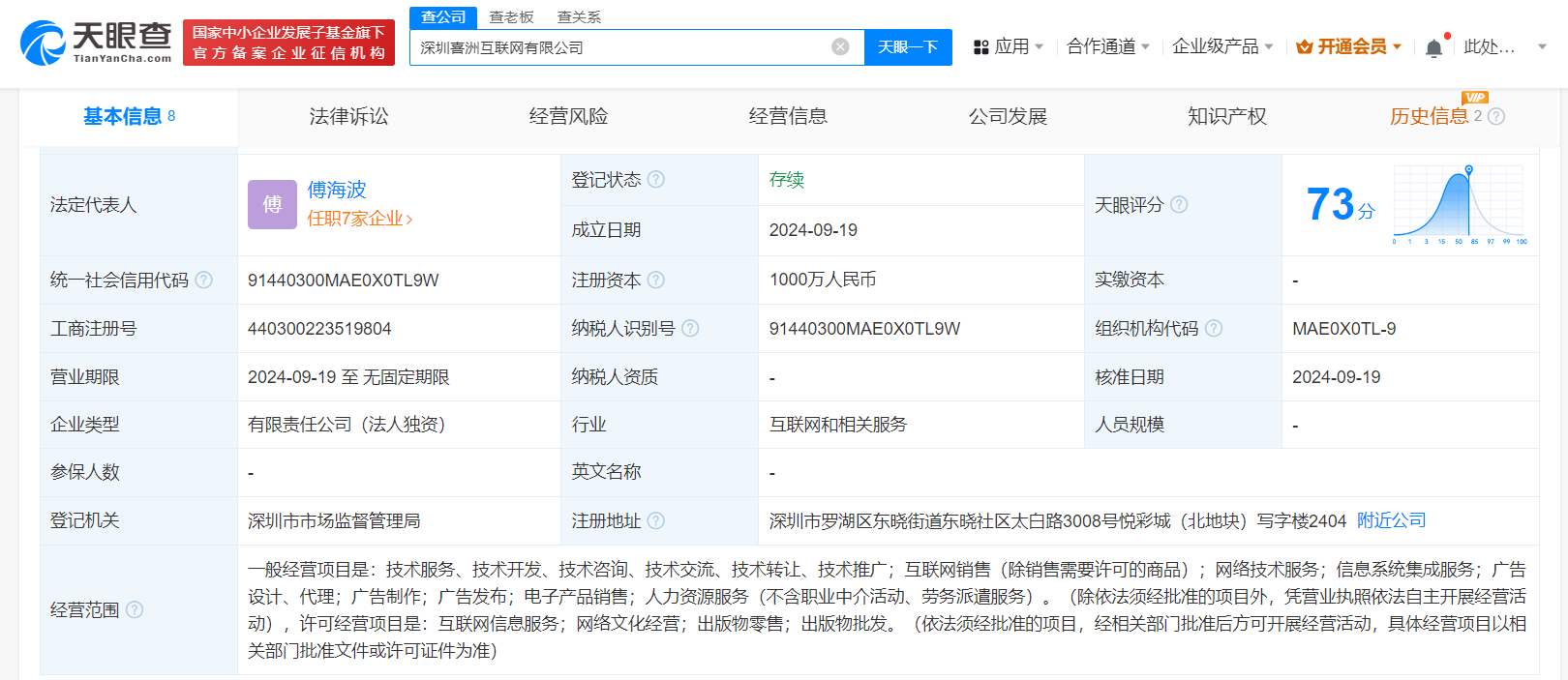 南方财经9月20日电,天眼查App显示,近日,深圳喜洲互联网有限公司成立,法定代表人为傅海波,注册资本1000万人民币,经营范围含联网销售,网络技术服务,信息系统集成服务,广告设计、代理,互联网信息服务,网络文化经营等。股东信息显示,该公司由上海喜马拉雅科技有限公司全资持股。