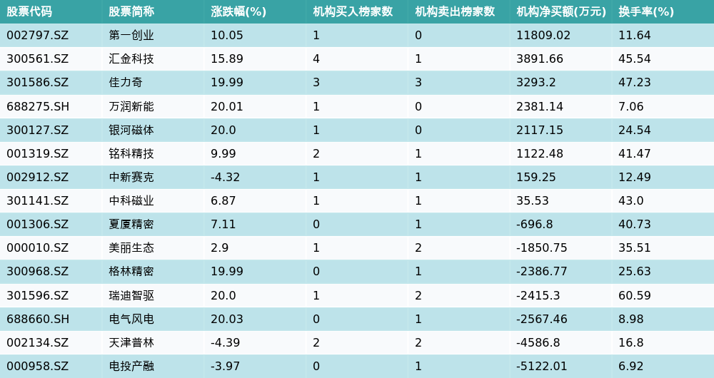 南方财经11月5日电,南财金融终端数据显示,因当日异动登上龙虎榜的个股中,15只沪深A股龙虎榜出现了机构的身影,机构合计净买入5183.54万元,具体来看,机构净买入8只个股,净卖出7只个股。其中,机构净买入前三分别为第一创业(002797.SZ)、汇金科技(300561.SZ)与佳力奇(301586.SZ),详情见下图: