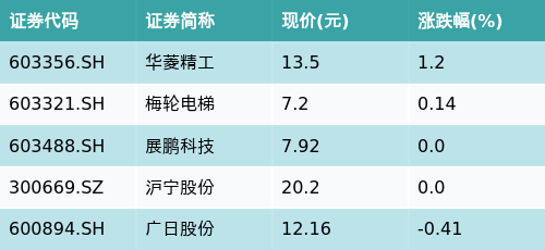 截至收盘,电梯主题涨跌幅最高的五只股票为:华菱精工(603356.SH)、梅轮电梯(603321.SH)、展鹏科技(603488.SH)、沪宁股份(300669.SZ)与广日股份(600894.SH)。详情见下表: