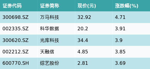 截至收盘,量子通信主题涨跌幅最高的五只股票为:万马科技(300698.SZ)、科华数据(002335.SZ)、光库科技(300620.SZ)、天融信(002212.SZ)与综艺股份(600770.SH)。详情见下表: