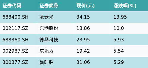 截至午间收盘,Web3.0主题涨跌幅最高的五只股票为:凌云光(688400.SH)、东港股份(002117.SZ)、德马科技(688360.SH)、京北方(002987.SZ)与赢时胜(300377.SZ)。详情见下表: