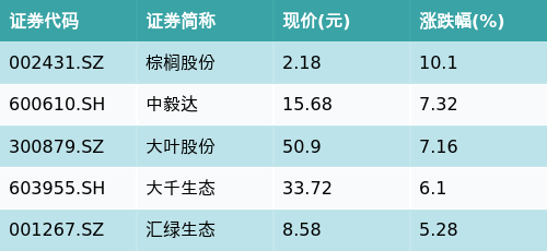 南财智讯5月19日电,天眼查数据显示,今日园林主题走强,截至早盘收盘(下同)上涨2.22%。持有园林主题股票的南方中证1000ETF(512100)早盘下跌0.7%,最新价报2.415元。截至上个交易日(5月16日),该基金近五个交易日净值(复权单位净值,下同)下跌0.18%,近一个月净值上涨4.14%。该基金自(20160929)成立以来净值增长率为-9.72%,管理人为南方基金管理股份有限公司,基金经理为崔蕾。截至早盘收盘,园林主题涨跌幅最高的五只股票为:棕榈股份(002431.SZ)、中毅达(600610.SH)、大叶股份(300879.SZ)、大千生态(603955.SH)与汇绿生态(001267.SZ)。详情见下表:
