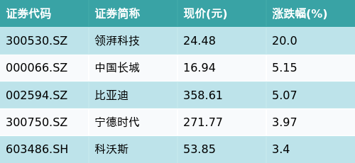 截至午间收盘,电芯及PACK主题涨跌幅最高的五只股票为:领湃科技(300530.SZ)、中国长城(000066.SZ)、比亚迪(002594.SZ)、宁德时代(300750.SZ)与科沃斯(603486.SH)。详情见下表: