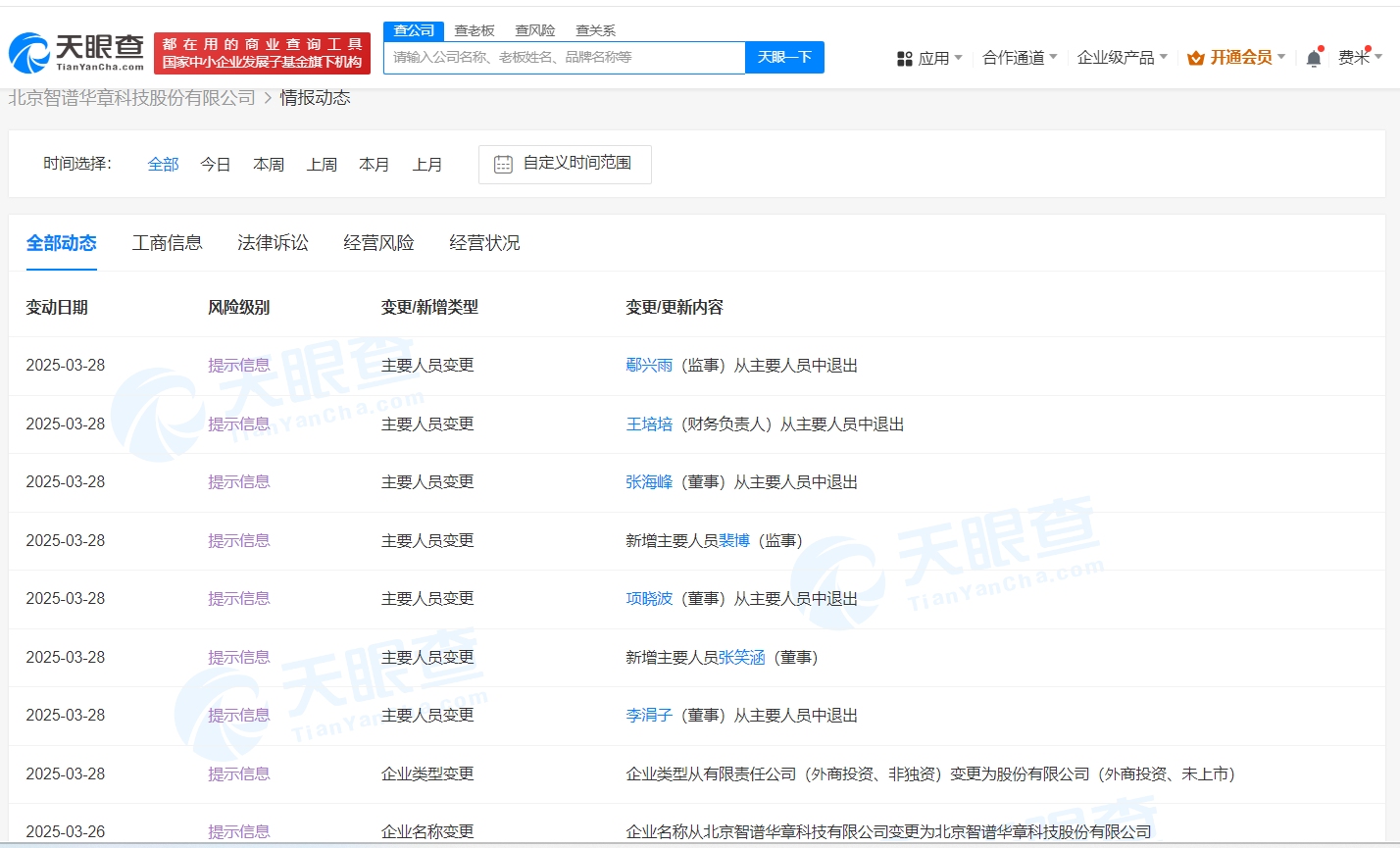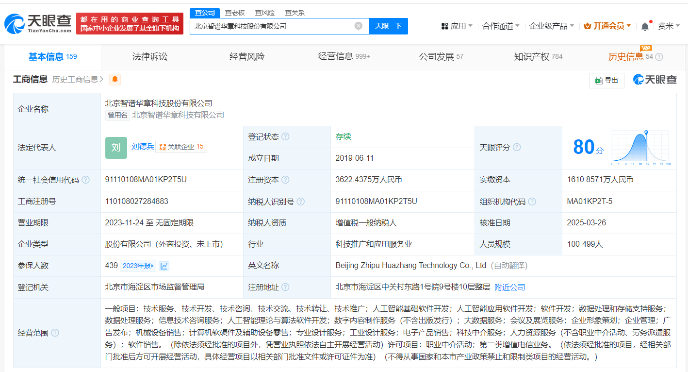 南方财经3月28日电,天眼查App显示,近日,北京智谱华章科技有限公司发生工商变更,企业名称变更为北京智谱华章科技股份有限公司,同时部分主要人员发生变更。该公司成立于2019年6月,法定代表人为刘德兵,注册资本约3622万人民币,经营范围包括人工智能基础软件开发、人工智能应用软件开发、数据处理和存储支持服务、数据处理服务、信息技术咨询服务、人工智能理论与算法软件开发等,由唐杰、广西腾讯创业投资有限公司、北京市人工智能产业投资基金(有限合伙)等共同持股。