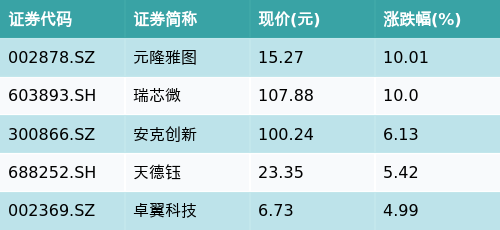 截至午间收盘,智能音箱主题涨跌幅最高的五只股票为:元隆雅图(002878.SZ)、瑞芯微(603893.SH)、安克创新(300866.SZ)、天德钰(688252.SH)与卓翼科技(002369.SZ)。详情见下表: