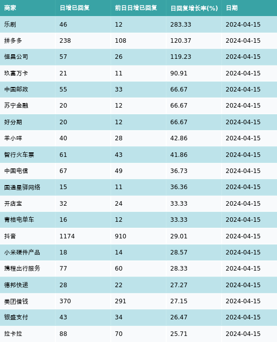 黑猫投诉:乐刷、拼多多和恒昌公司4月15日投诉回复增速最高