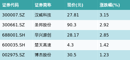 截至收盘,无线耳机主题涨跌幅最高的五只股票为:汉威科技(300007.SZ)、圣邦股份(300661.SZ)、华兴源创(688001.SH)、楚天高速(600035.SH)与博杰股份(002975.SZ)。详情见下表: