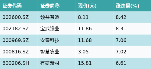 截至收盘,小金属概念主题涨跌幅最高的五只股票为:领益智造(002600.SZ)、宝武镁业(002182.SZ)、安泰科技(000969.SZ)、智慧农业(000816.SZ)与有研新材(600206.SH)。详情见下表: