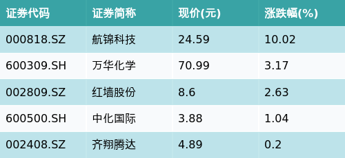 截至午间收盘,环氧丙烷主题涨跌幅最高的五只股票为:航锦科技(000818.SZ)、万华化学(600309.SH)、红墙股份(002809.SZ)、中化国际(600500.SH)与齐翔腾达(002408.SZ)。详情见下表: