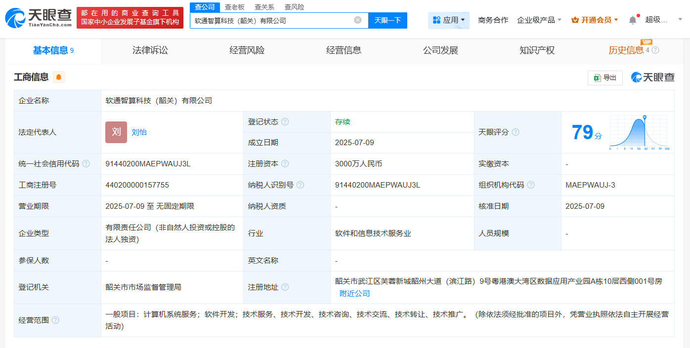 南方财经7月11日电,天眼查App显示,近日,软通智算科技(韶关)有限公司成立,法定代表人为刘怡,注册资本3000万人民币,经营范围包括计算机系统服务、软件开发等。股东信息显示,该公司由软通动力(301236)旗下软通智算科技(广东)集团有限公司全资持股。