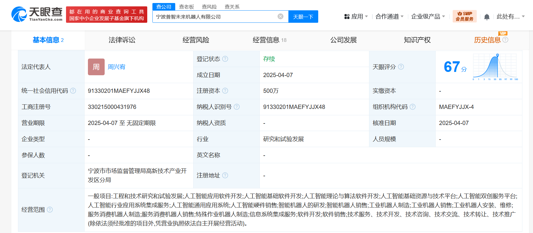 南方财经4月8日电,天眼查App显示,近日,宁波普智未来机器人有限公司成立,法定代表人为周兴宥,注册资本500万人民币,经营范围含工程和技术研究和试验发展、人工智能应用软件开发、人工智能基础软件开发、智能机器人的研发、智能机器人销售、工业机器人制造等。股东信息显示,该公司由宁波均普人工智能与人形机器人研究院有限公司以及智元机器人关联公司上海智元新创技术有限公司共同持股。