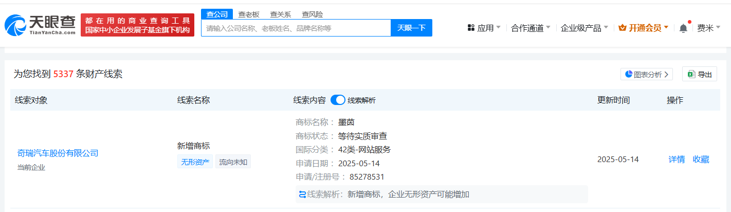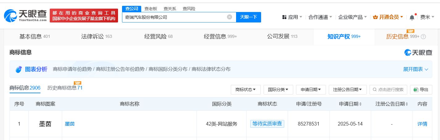 南方财经6月12日电,天眼查财产线索信息显示,近日,奇瑞汽车股份有限公司申请注册“墨茵”商标,国际分类为网站服务,当前商标状态为等待实质审查。据媒体报道,今年3月,奇瑞汽车在芜湖奇瑞智造一工厂举办智能化战略发布会,透露其人形机器人Mornine(墨茵)已在马来西亚的汽车4S店投入使用。