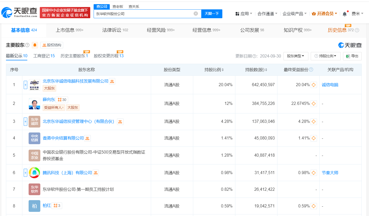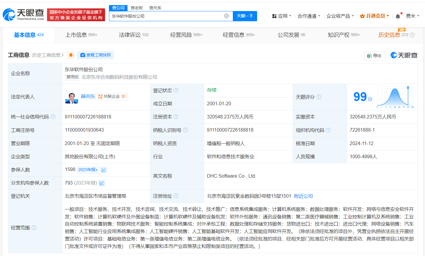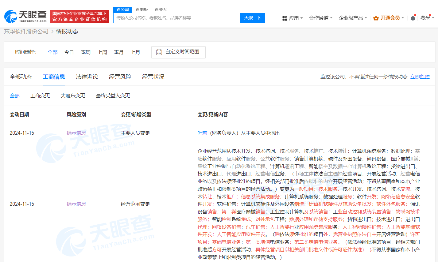 南方财经11月15日电,天眼查App显示,近日,东华软件(002065)发生工商变更,经营范围新增人工智能硬件销售、人工智能基础软件开发、人工智能应用软件开发、汽车销售、物联网技术服务等。东华软件股份公司成立于2001年1月,法定代表人为薛向东,注册资本约32亿人民币,由北京东华诚信电脑科技发展有限公司、薛向东、北京东华诚信投资管理中心(有限合伙)等共同持股。