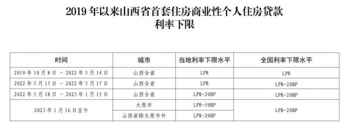 山西:2023年1月16日至今太原首套房贷利率下限为LPR-50BP 其他地区为LPR-20BP