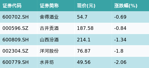 截至收盘,次高端白酒主题涨跌幅最高的五只股票为:舍得酒业(600702.SH)、古井贡酒(000596.SZ)、山西汾酒(600809.SH)、洋河股份(002304.SZ)与水井坊(600779.SH)。详情见下表: