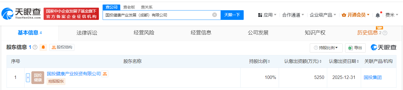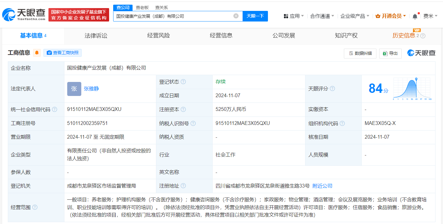 国投健康产业投资公司在成都成立新公司 注册资本5250万