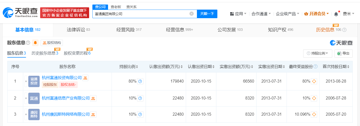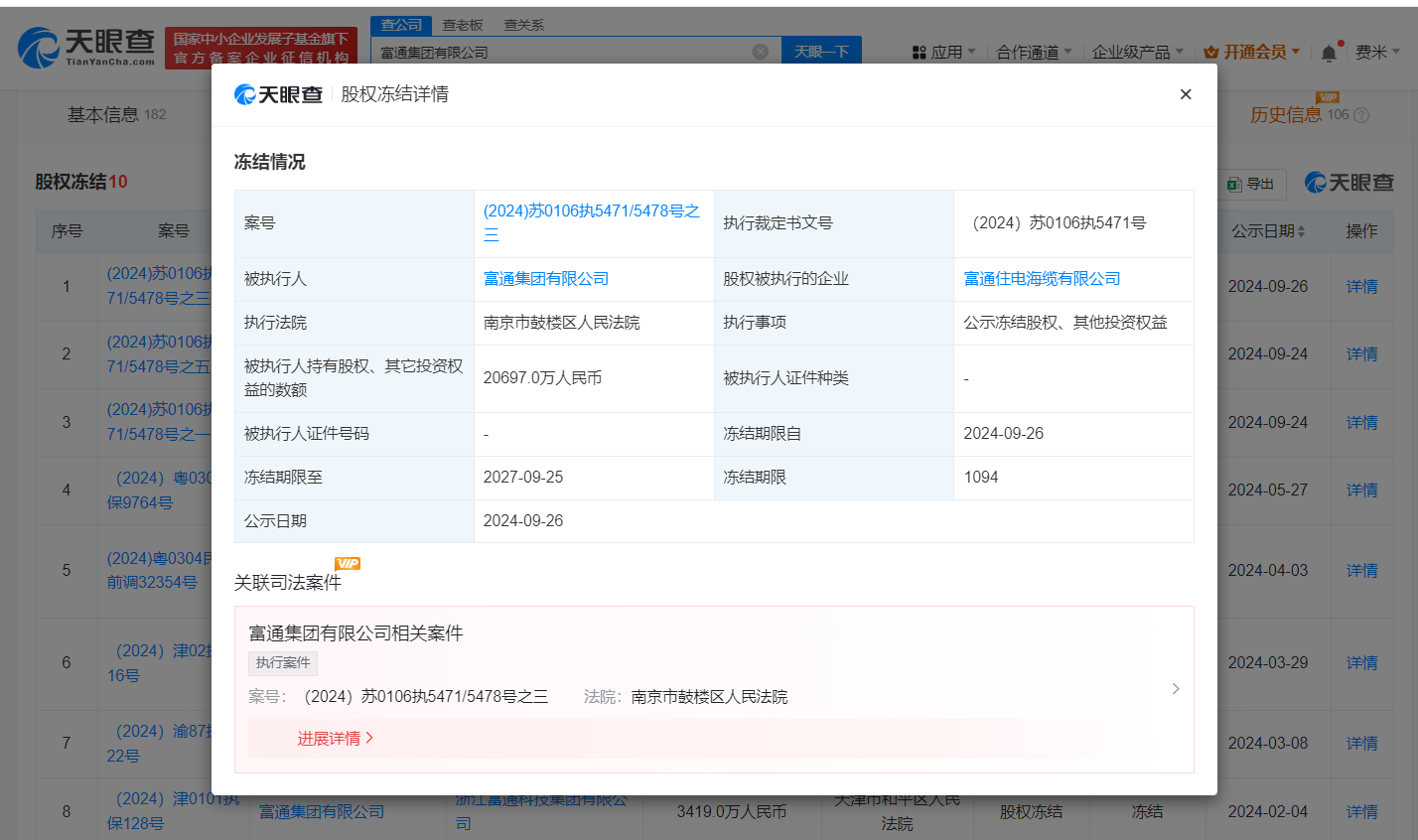 南方财经10月8日电,天眼查法律诉讼信息显示,近日,富通集团有限公司新增一则股权冻结信息,冻结股权数额2亿余元,被执行人为该公司,股权被执行的企业为富通住电海缆有限公司,冻结期限自2024年9月26日至2027年9月25日,执行法院为南京市鼓楼区人民法院。富通集团有限公司成立于1994年1月,法定代表人为王建沂,注册资本22.48亿人民币,由杭州富通投资有限公司、杭州富通信息产业有限公司、杭州康因斯特网络有限公司共同持股。天眼风险信息显示,该公司现存多条被执行人、股权冻结和终本案件信息。