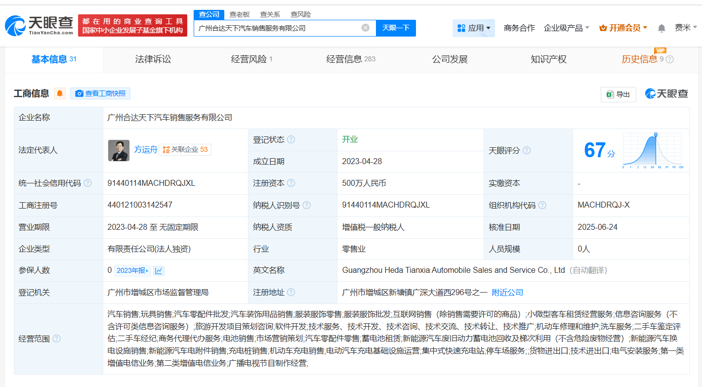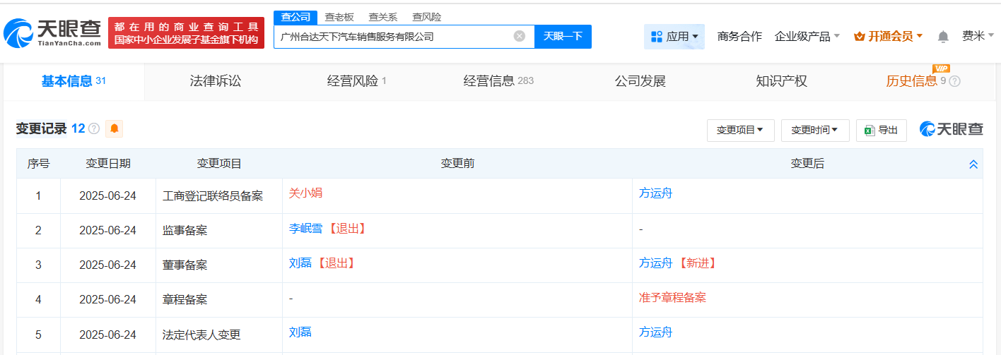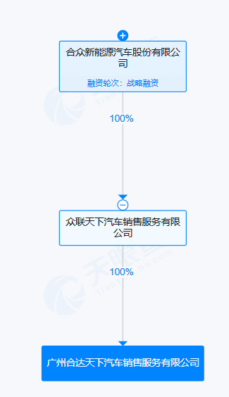 南方财经7月1日电,天眼查App显示,近日,广州合达天下汽车销售服务有限公司发生工商变更,刘磊卸任法定代表人、董事、经理,由方运舟接任。该公司成立于2023年4月,注册资本500万人民币,经营范围包括汽车销售、玩具销售、汽车零配件批发等。股权全景穿透图显示,该公司由哪吒汽车关联公司合众新能源汽车股份有限公司子公司众联天下汽车销售服务有限公司全资持股。