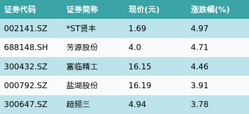 截至收盘,正极材料主题涨跌幅最高的五只股票为:*ST贤丰(002141.SZ)、芳源股份(688148.SH)、富临精工(300432.SZ)、盐湖股份(000792.SZ)与超频三(300647.SZ)。详情见下表: