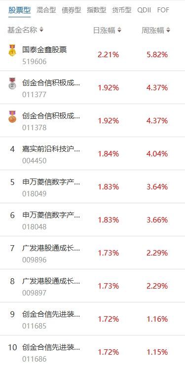 南方财经4月18日电,根据南财基金通数据:2025年04月17日当日收益靠前的股票型基金包括:国泰金鑫股票型证券投资基金(519606,日收益2.21%);创金合信积极成长股票型发起式证券投资基金(011377,日收益1.92%);嘉实前沿科技沪港深股票型证券投资基金(004450,日收益1.84%)等。收益较低的股票型基金包括:中欧高端装备股票型发起式证券投资基金(016848,日收益-1.05%);广发资源优选股票型发起式证券投资基金(005402,日收益-0.95%);中海医疗保健主题股票型证券投资基金(399011,日收益-0.85%)等。