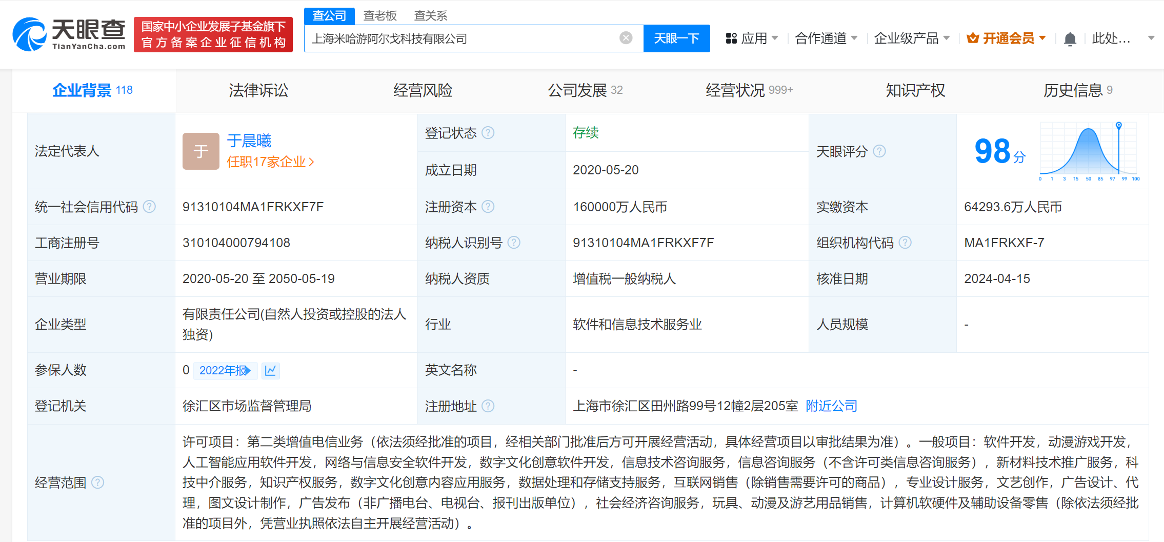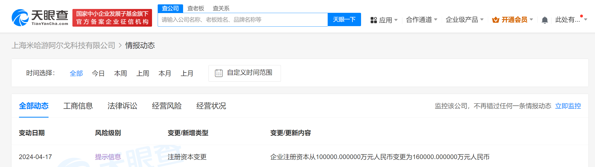 南方财经4月18日电,天眼查App显示,近日,上海米哈游阿尔戈科技有限公司发生工商变更,注册资本由10亿人民币增至16亿人民币。上海米哈游阿尔戈科技有限公司成立于2020年5月,法定代表人为于晨曦,经营范围含软件开发、动漫游戏开发、人工智能应用软件开发、网络与信息安全软件开发、数字文化创意软件开发、信息技术咨询服务等。股东信息显示,该公司由上海米哈游网络科技股份有限公司全资持股。
