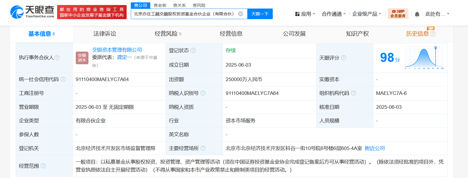 南方财经6月6日电,天眼查App显示,近日,北京亦庄工融交融股权投资基金合伙企业(有限合伙)成立,执行事务合伙人为交银资本管理有限公司,出资额25亿人民币,经营范围为以私募基金从事股权投资、投资管理、资产管理等活动。合伙人信息显示,该基金由北京亦庄国际投资发展有限公司、工银金融资产投资有限公司、交银金融资产投资有限公司等共同出资。