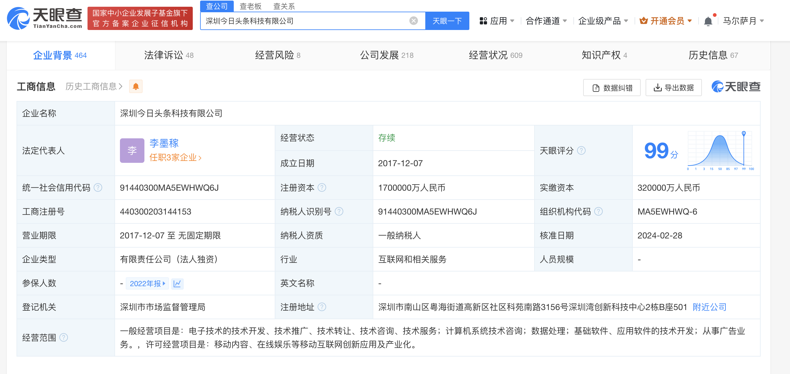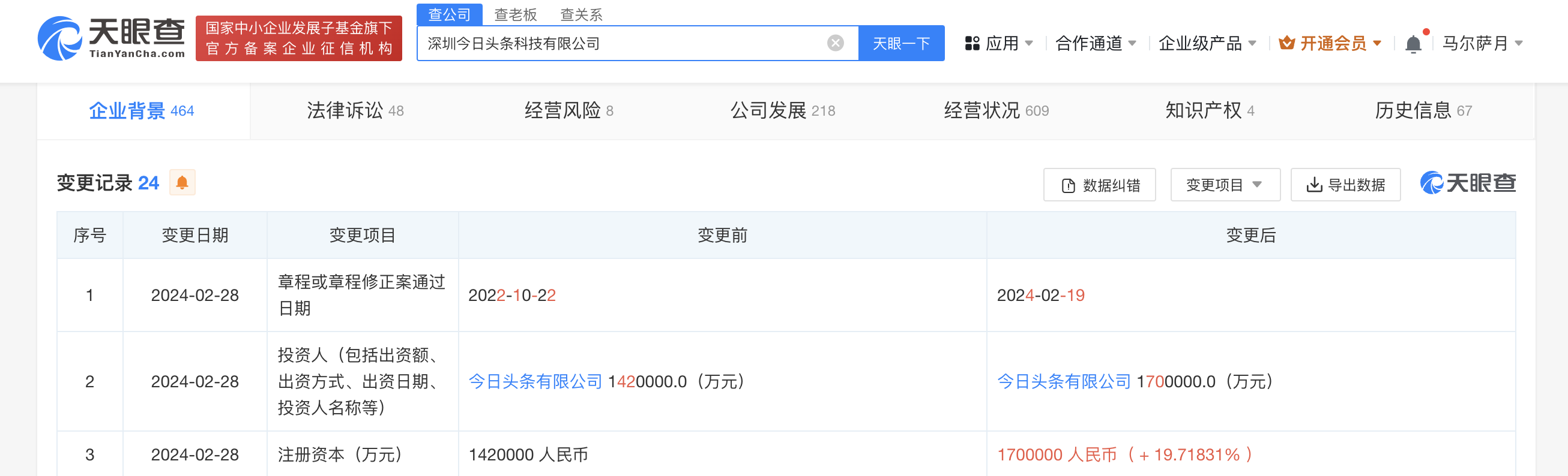 南方财经2月29日电,天眼查App显示,近日,深圳今日头条科技有限公司发生工商变更,注册资本由142亿人民币增至170亿人民币,增幅约19.72%。该公司成立于2017年12月,法定代表人为李墨稼,经营范围含电子技术的技术开发、技术推广、技术转让、技术咨询、技术服务,计算机系统技术咨询,数据处理等。股东信息显示,该公司由今日头条有限公司全资持股。