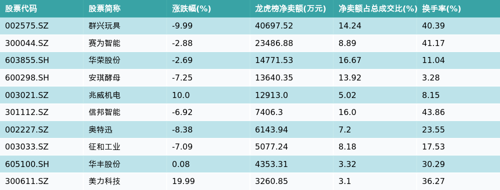 南方财经3月5日电,南财金融终端数据显示,因当日异动登上龙虎榜的个股中,龙虎榜中资金净流出最多的前三位分别是群兴玩具(002575.SZ)、赛为智能(300044.SZ)与华荣股份(603855.SH)。其中排名第一的群兴玩具被净卖出4.07亿元,占总成交金额的14.24%。群兴玩具收盘下跌9.99%,换手率为40.39%。净卖出额前10个股详情见下图: