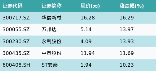 截至收盘,煤化工主题涨跌幅最高的五只股票为:华信新材(300717.SZ)、万邦达(300055.SZ)、永利股份(300230.SZ)、中泰股份(300435.SZ)与ST安泰(600408.SH)。详情见下表: