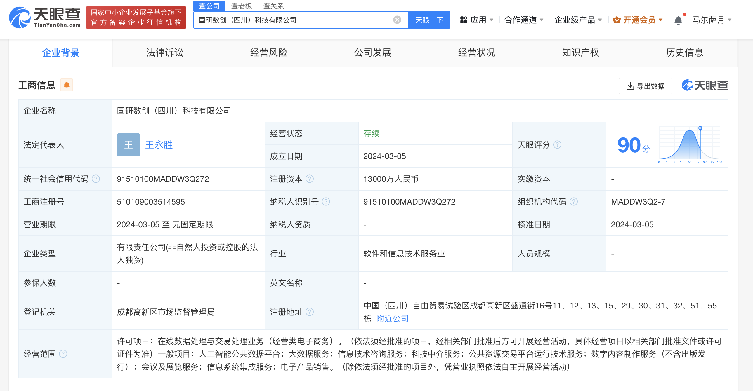 南方财经3月7日电,天眼查App显示,近日,国研数创(四川)科技有限公司成立,法定代表人为王永胜,注册资本1.3亿人民币,经营范围含在线数据处理与交易处理业务、人工智能公共数据平台、科技中介服务、电子产品销售等。股东信息显示,该公司由国研科技集团有限公司全资持股。