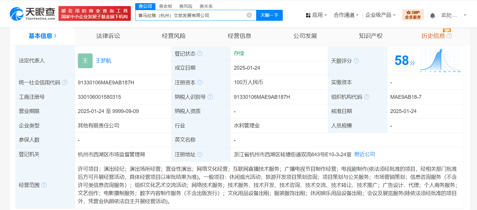 喜马拉雅等在杭州成立文旅发展公司 含营业性演出业务