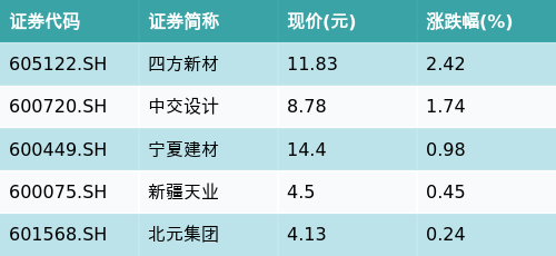 截至收盘,水泥概念主题涨跌幅最高的五只股票为:四方新材(605122.SH)、中交设计(600720.SH)、宁夏建材(600449.SH)、新疆天业(600075.SH)与北元集团(601568.SH)。详情见下表: