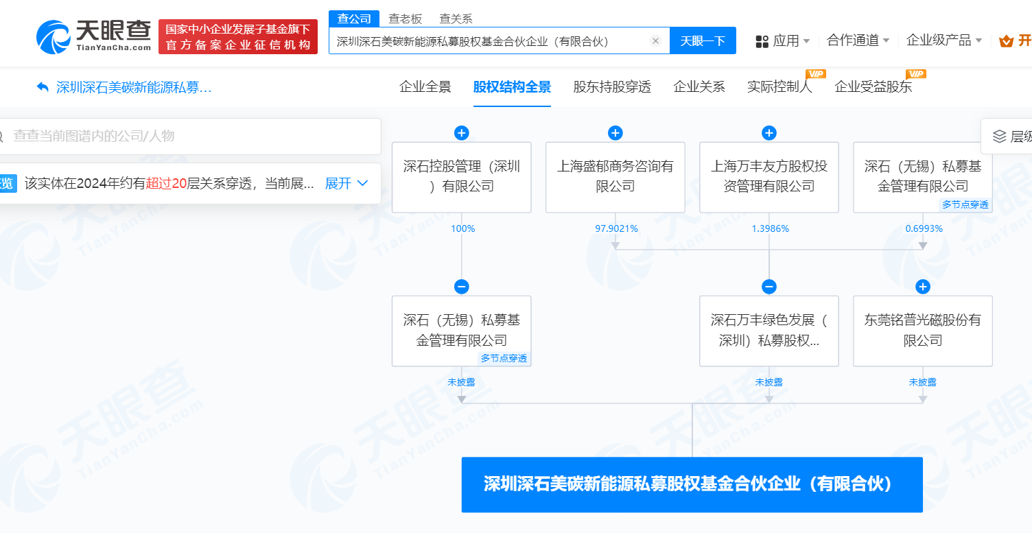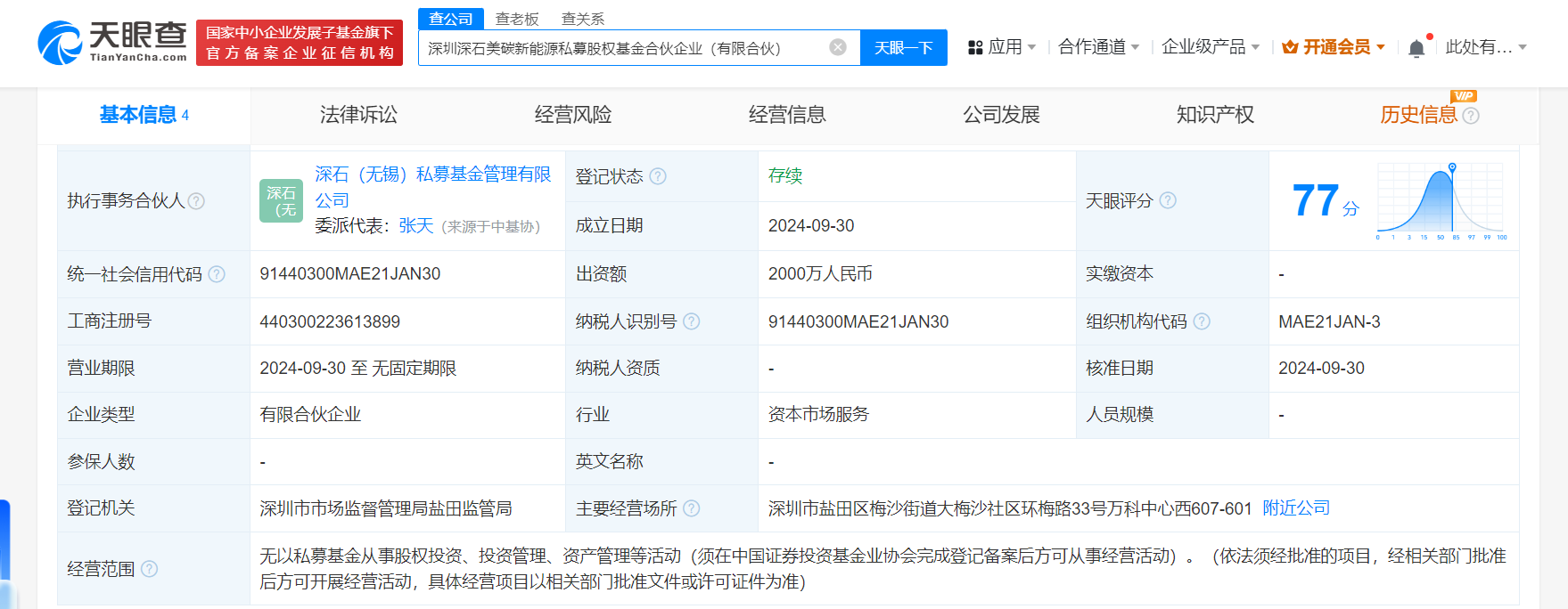 南方财经10月8日电,天眼查App显示,近日,深圳深石美碳新能源私募股权基金合伙企业(有限合伙)成立,执行事务合伙人为深石(无锡)私募基金管理有限公司,出资额2000万人民币,经营范围为以私募基金从事股权投资、投资管理、资产管理等活动。合伙人信息显示,该基金由深石资本旗下深石(无锡)私募基金管理有限公司、深石万丰绿色发展(深圳)私募股权投资基金合伙企业(有限合伙)以及铭普光磁(002902)共同出资。