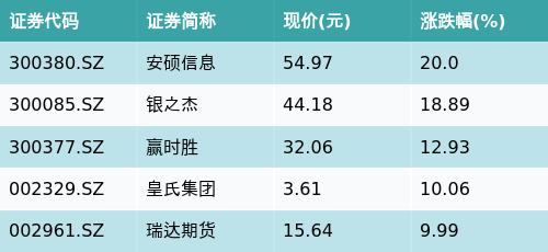 截至早盘收盘,互联网金融主题涨跌幅最高的五只股票为:安硕信息(300380.SZ)、银之杰(300085.SZ)、赢时胜(300377.SZ)、皇氏集团(002329.SZ)与瑞达期货(002961.SZ)。详情见下表: