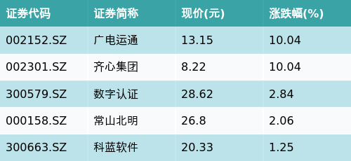 截至收盘,华为鸿蒙主题涨跌幅最高的五只股票为:广电运通(002152.SZ)、齐心集团(002301.SZ)、数字认证(300579.SZ)、常山北明(000158.SZ)与科蓝软件(300663.SZ)。详情见下表: