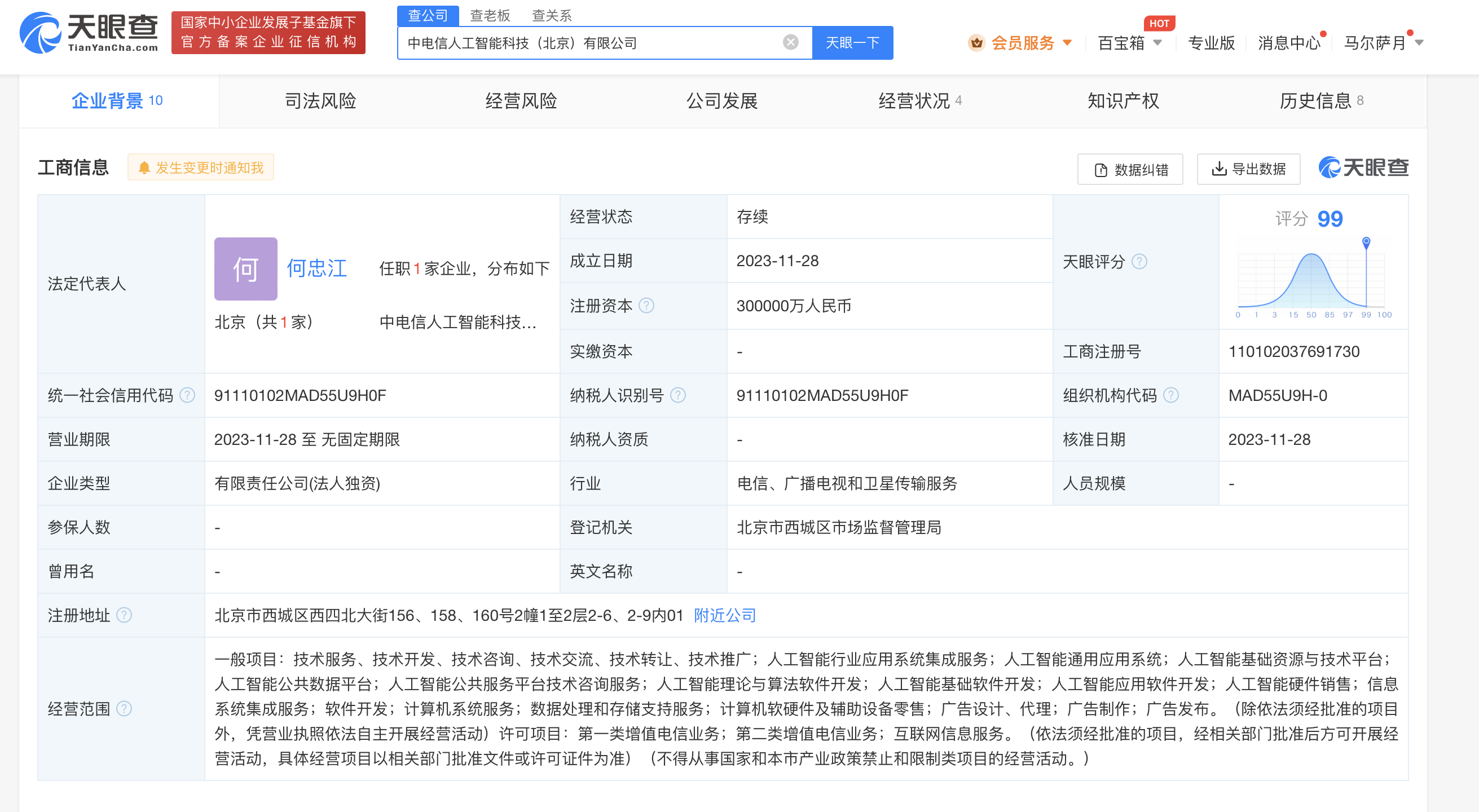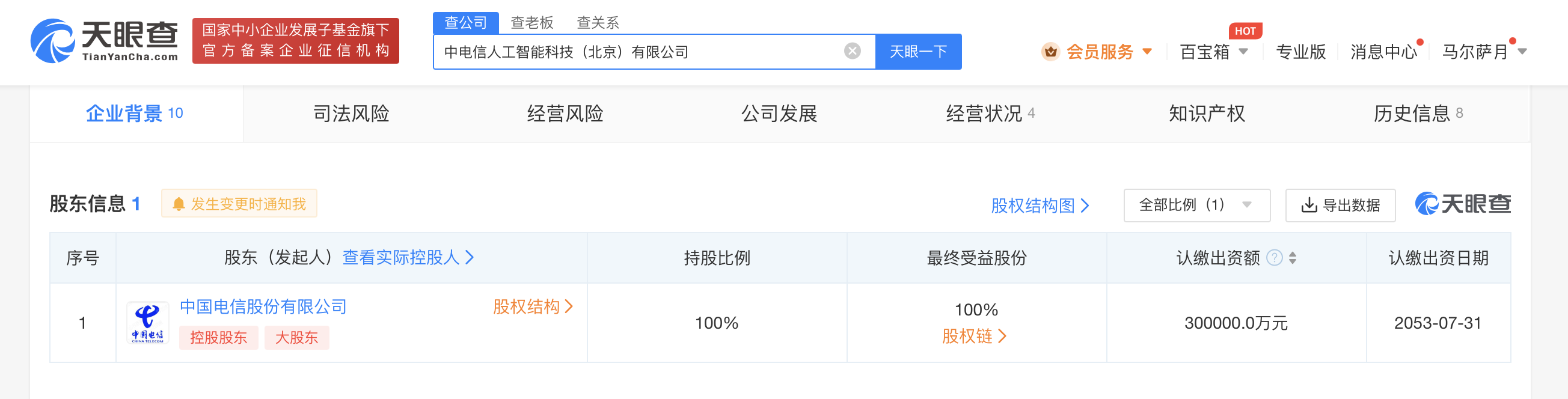 南方财经12月4日电,天眼查App显示,近日,中电信人工智能科技(北京)有限公司成立,法定代表人为何忠江,注册资本30亿人民币,经营范围包括技术服务、人工智能行业应用系统集成服务、人工智能公共数据平台、人工智能硬件销售、广告设计、第一类增值电信业务、第二类增值电信业务、互联网信息服务等。股东信息显示,该公司由中国电信(601728)全资持股。