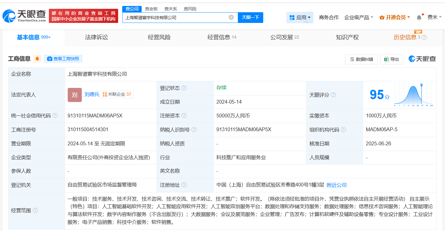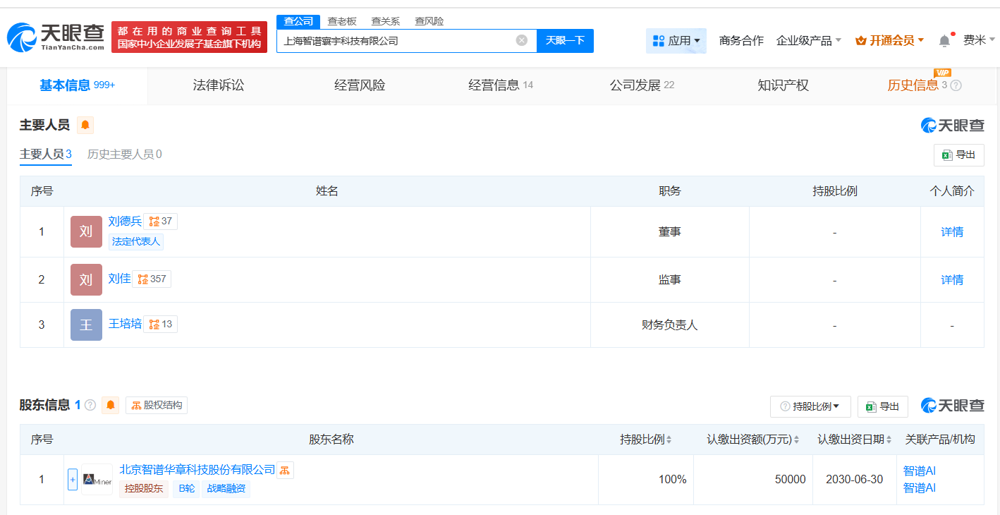 南方财经7月3日电,天眼查App显示,近日,上海智谱寰宇科技有限公司发生工商变更,注册资本由1000万人民币增至5亿人民币,增幅4900%,同时刘德兵由执行董事改任董事。该公司成立于2024年5月,法定代表人为刘德兵,经营范围包括人工智能基础软件开发、人工智能应用软件开发、数据处理和存储支持服务等,由智谱AI关联公司北京智谱华章科技股份有限公司全资持股。