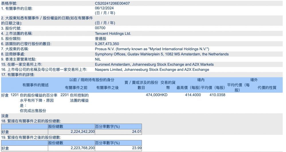 腾讯大股东Prosus继续减持:持股比例降至23.99%